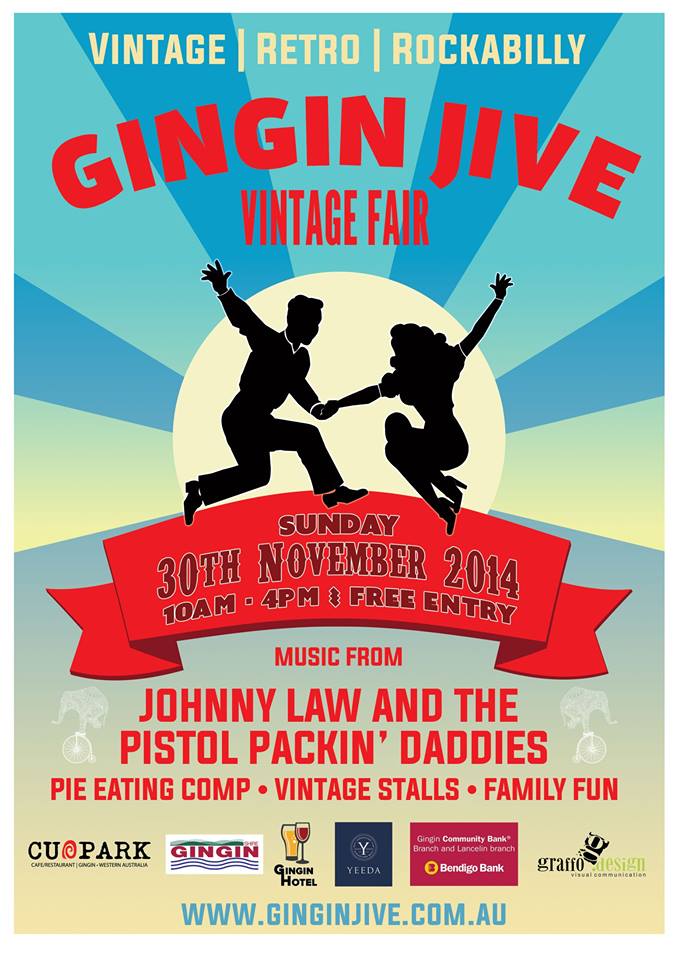 This is an invitation to all vintage loving gals and guys to join us in the picturesque town of Gingin on 30th November 2014 for the Gingin Jive Vintage Fair – an event filled with everything vintage and retro of course! This exciting vintage fair will kick off at 10am with a vintage market in the Granville grounds. In collaboration with local community groups there will be vintage fashion and makeovers, swing dancers, bands, a tattoo expo, farmers market, vintage and muscle car displays, competitions and much more. Bands to be announced soon!